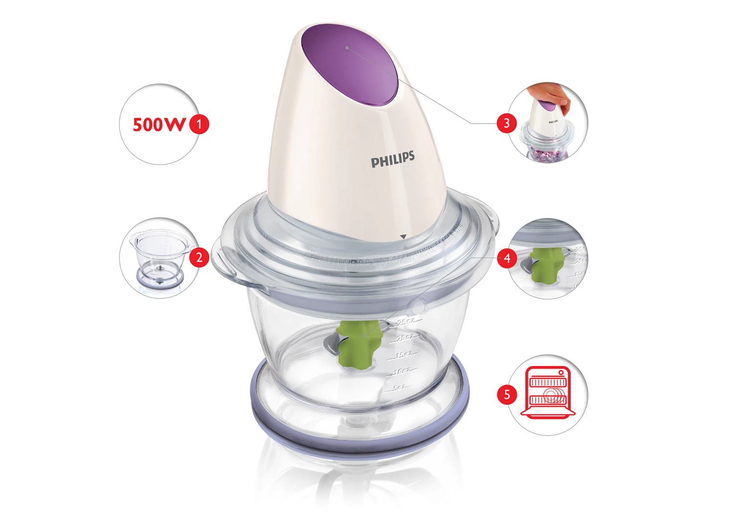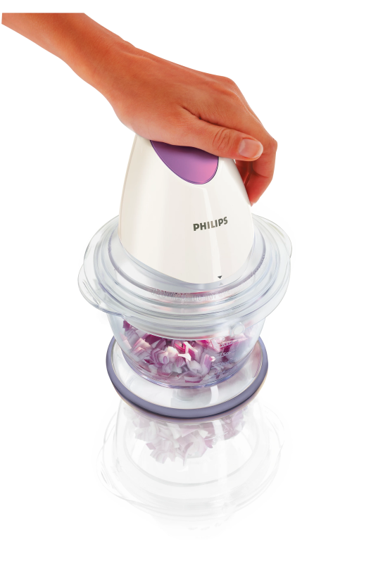 Make food preparation faster and easier with the Philips Lavender Molokhia Chopper (HR1397). Designed for convenience and performance, this powerful 500W chopper handles everything from vegetables and herbs to meat, nuts, and cheese — with just a simple press of a button!